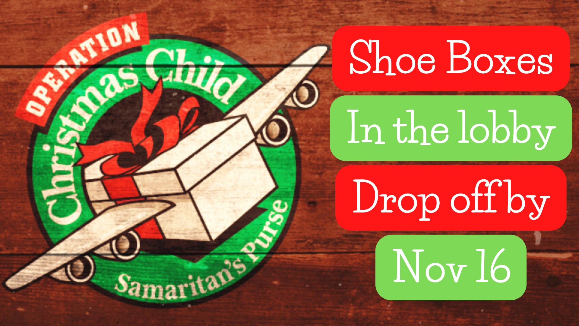 We are super excited to support Operation Christmas Child again this year by helping fill shoe boxes to bless kids this Christmas with gifts and encouragement. Shoe boxes are in the foyer. Please take one, fill it, and bring it back to the Church by Sunday, Nov 16.